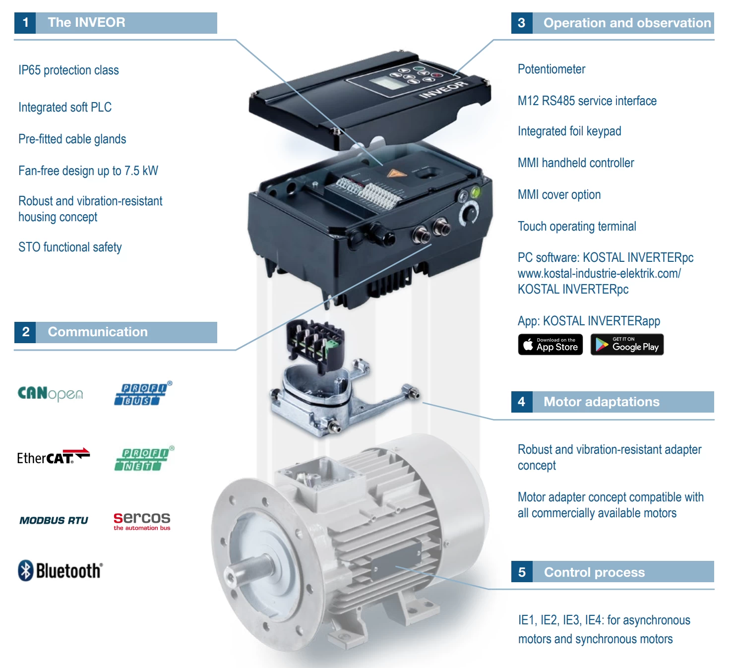 Compared to an inverter in the control cabinet, this decentralized solution reduces the costs for wiring and installation and by eliminating the shielded motor cable.
