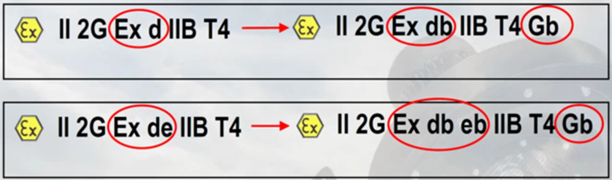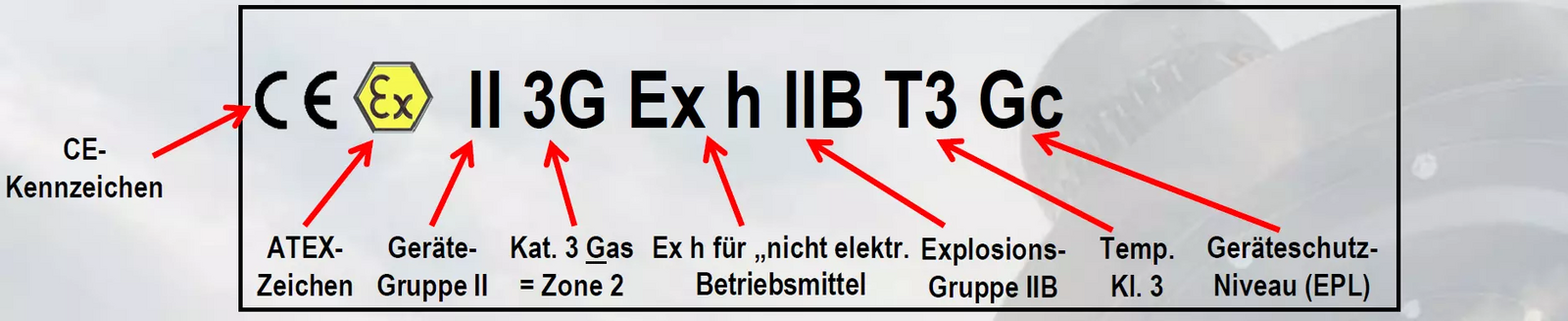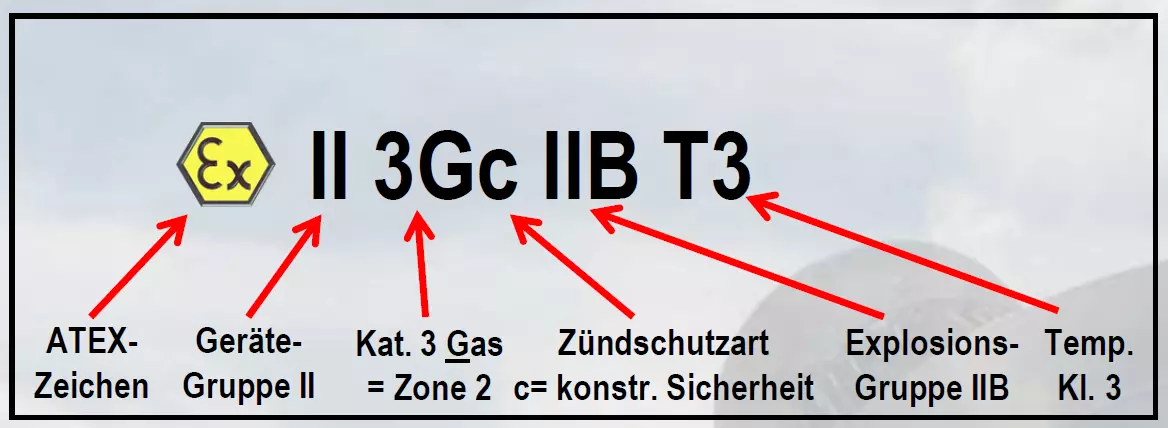 - Ergänzung des Kennbuchstabens für das Geräteschutzniveau hinter dem e: b für Zone 1 und c für Zone 2. Nochmals Ergänzung des kompletten Geräteschutzniveaus am Ende, bestehend aus G für Gas plus b für Zone 1 oder c für Zone 2.
