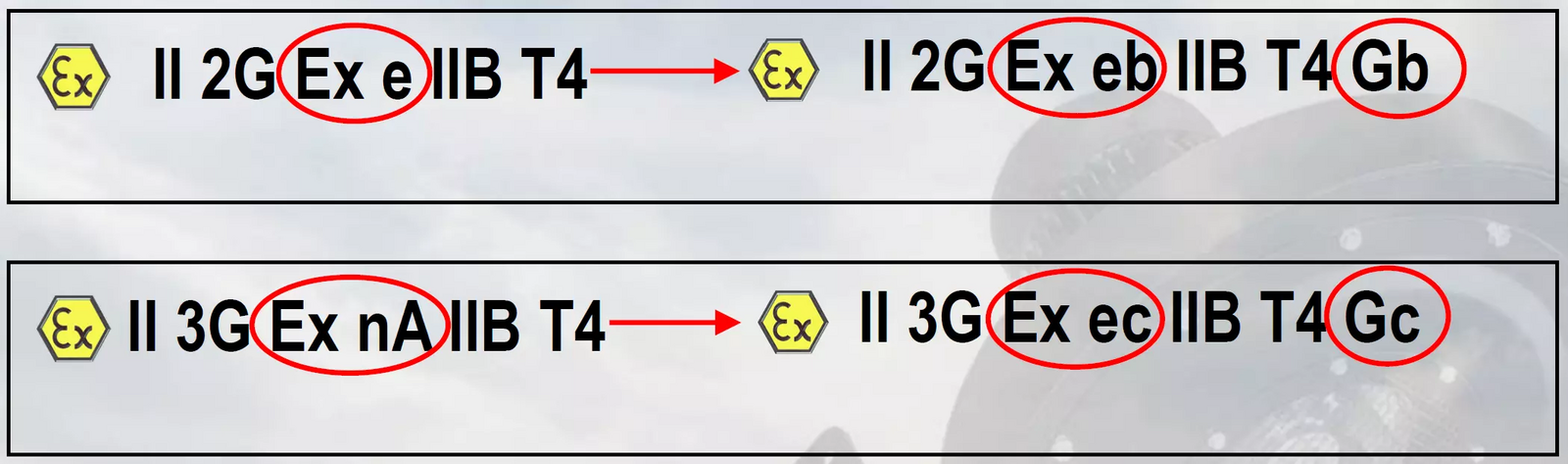 ATEX-Motoren für Zone 1 und 2 werden nach neuer EN 60079 (-7) auch mit Geräteschutzniveau gekennzeichnet: Zündschutzart e (=„erhöhte Sicherheit“) alt und neu, einmal für Zone 1 und einmal für Zone 2: