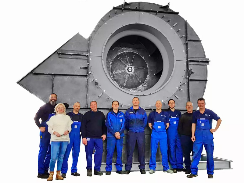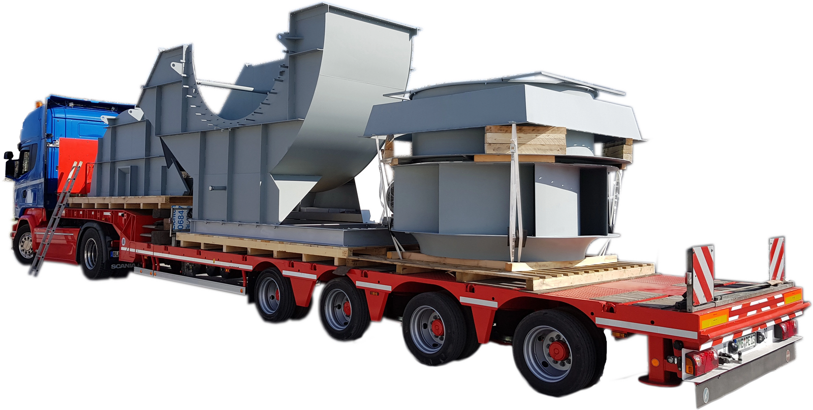 Vormontierter großvolumiger Karl Klein-Radialventilator, der nach der Endprüfung im Werk Eisenberg/Thüringen aus Transportgründen in einzelnen Komponenten beim Kunden angeliefert wird.